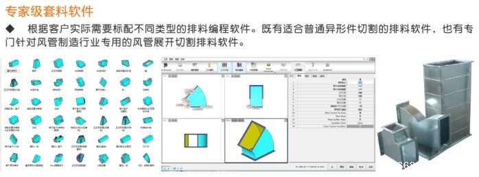 各种工业异形件加工;各种通风管道弯头切割加工(配合专用的风管选型与编程软件,轻松实现风管切割加工),各种薄板金属制品的切割加工(如:不锈钢厨具、炊具),广泛应用于各个行业的金属薄板切割加工。